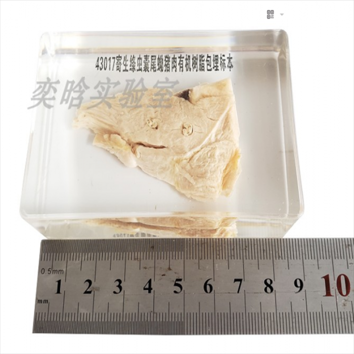 Mô hình mô tả cấu tạo của nang sán trong thịt lơn. Mô hình được đúc nhựa trong giúp bảo quản được lâu và dễ quan sát.